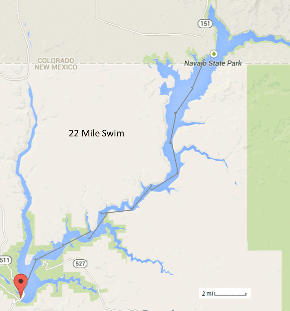 “My goal is to make it [35.4 km or 22 miles] across Navajo Lake [from its southern shores in the state of New Mexico to its northern side in the state of Colorado],” says the Idaho-based Gneiting who spoke about his previous sidestroking 14-mile Bear Lake double-crossing success. “When I come out here and succeed in swimming something like this, hopefully this will help change what people think about big people.”