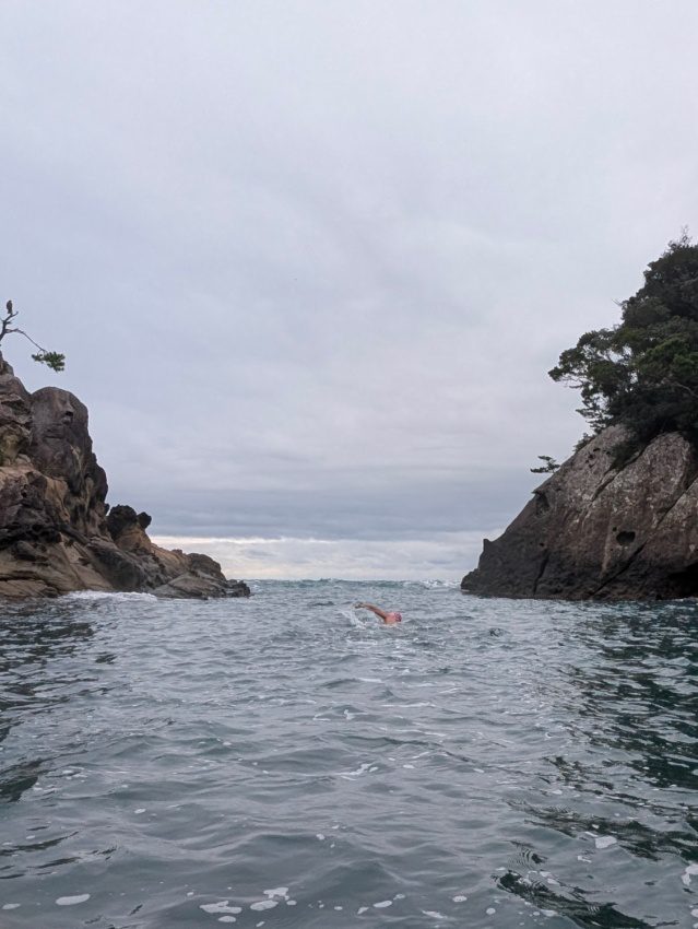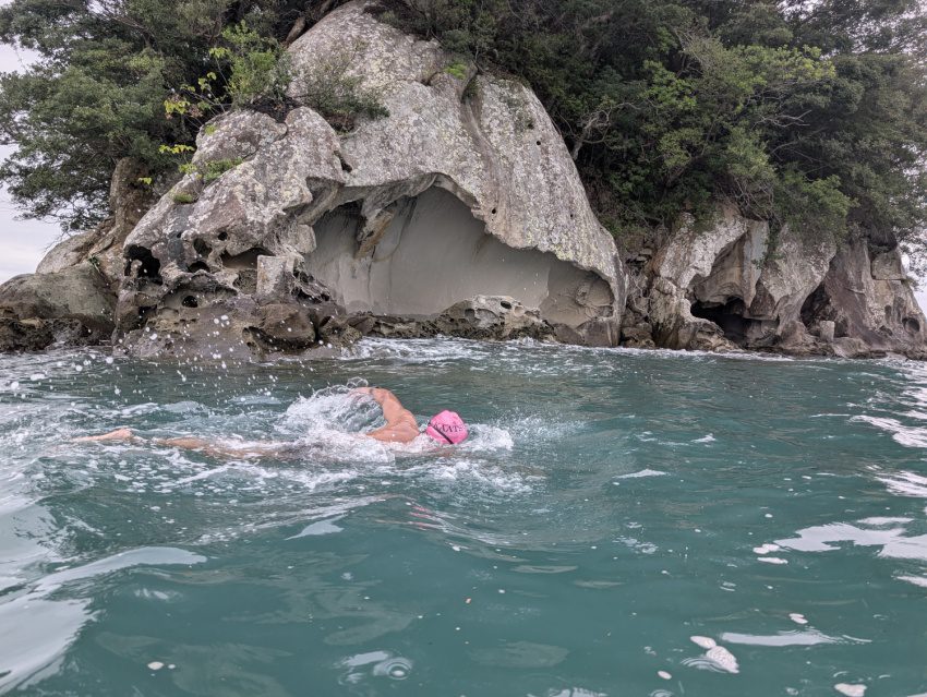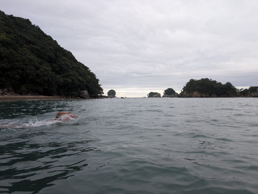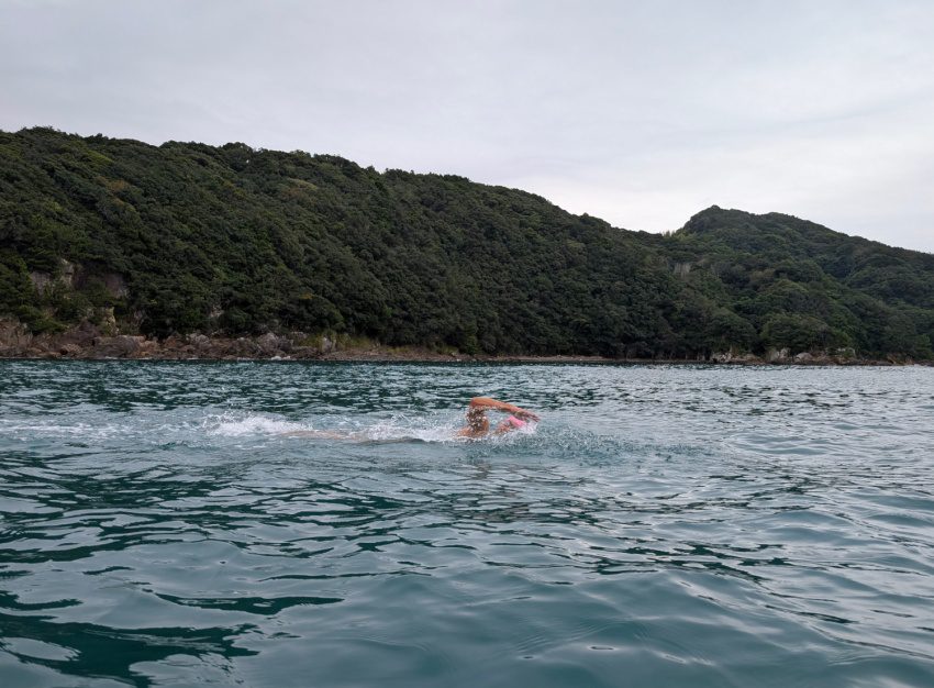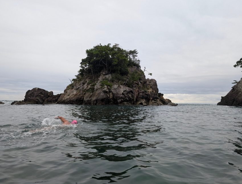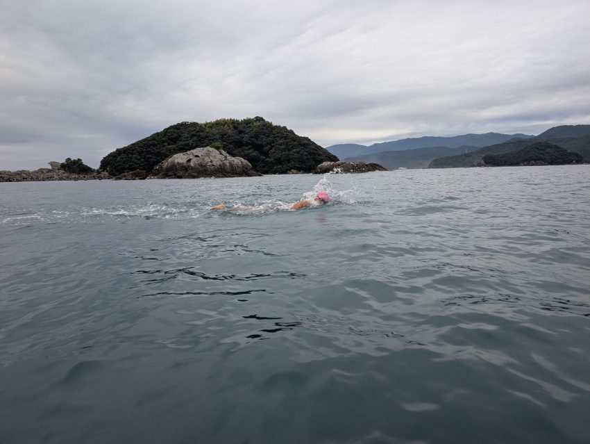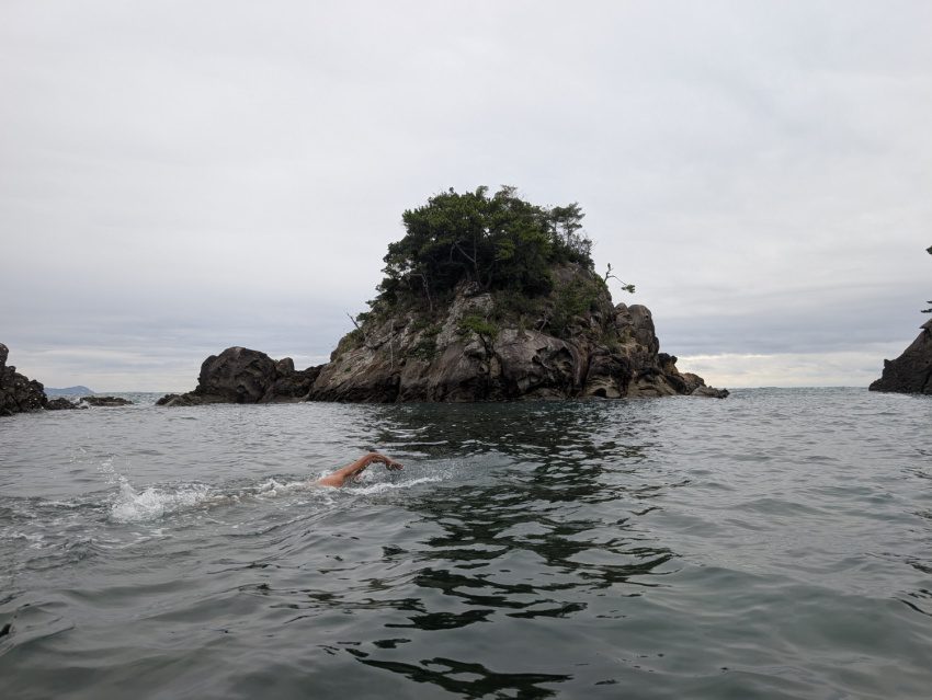 Swimming around islands is always an adventure – especially when you can circumnavigate many little ones – like the dozens that exist between the towns of Toyo and Kaiyō in Tokushima Prefecture. In particular, I was able to cruise around the exposed terrestrial points. It was an enjoyable morning spent open water orienteering to and around a number of outcroppings sandwiched near Takega Island, escorted by legendary kayaker Masaaki Sugimoto of Outdoor Sports Square (@outdoor_sports_square).
