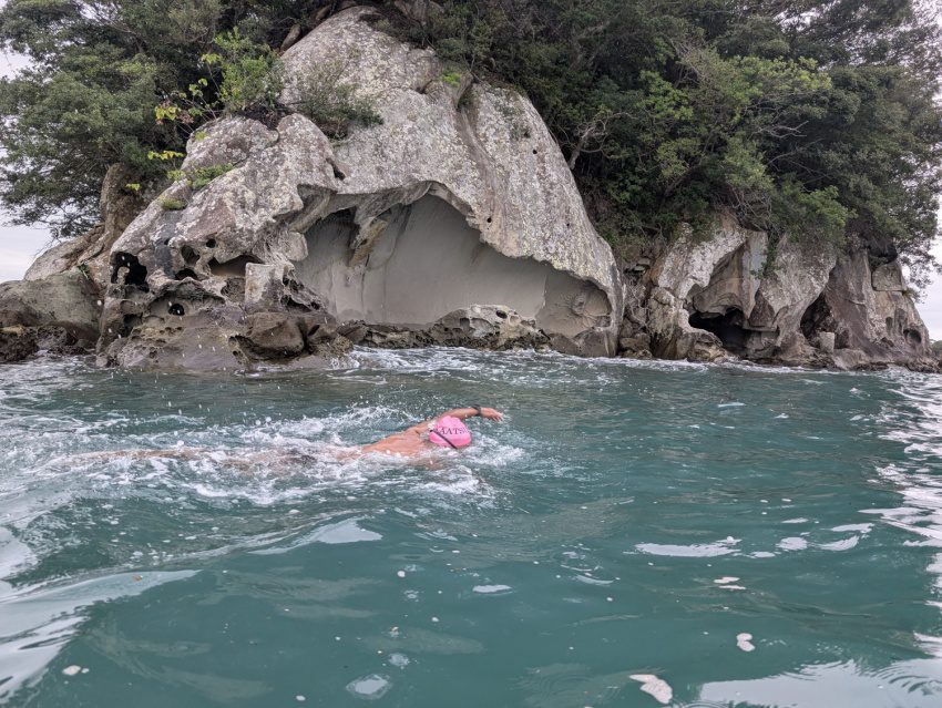 Swimming around islands is always an adventure – especially when you can circumnavigate many little ones – like the dozens that exist between the towns of Toyo and Kaiyō in Tokushima Prefecture. In particular, I was able to cruise around the exposed terrestrial points. It was an enjoyable morning spent open water orienteering to and around a number of outcroppings sandwiched near Takega Island, escorted by legendary kayaker Masaaki Sugimoto of Outdoor Sports Square (@outdoor_sports_square).