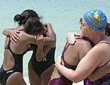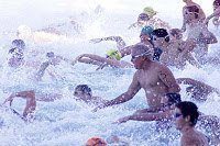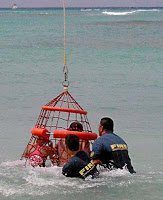 Likewise, in the US, the capabilities and fast action of the Honolulu lifeguards (Ocean Safety and Lifeguard Services Division) were evident during the 2003 Waikiki Roughwater Swim (upper photo shows start of annual event). During the 2003 event, hundreds of swimmers were rescued when powerful currents were too much for most of the swimmers. Of the 1,055 swimmers who started, only 356 finished including, remarkably, 71-year-old Jim Gaughran who finished in 1:51:07 and 72-year-old Graham Johnston who finished in 2:07:30.