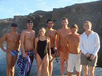 At the beginning of the S.C.A.R. adventure, the original 8 swimmers divided into pods of two, each pod accompanied by a kayak. Local swimmers Gordon Smith and Shauna Nelson were accompanied by kayaker, Candice Nicholas. Kurt Dickson and Patrick Brundage were accompanied by kayaker Wayne Rich. Harris and Barra were led by Jason Walters. Meg Zajdzinski and Kent Nicholas from Mesa Aquatics Club Masters were accompanied by Scott Mara and Glen Coy on a motorboat.