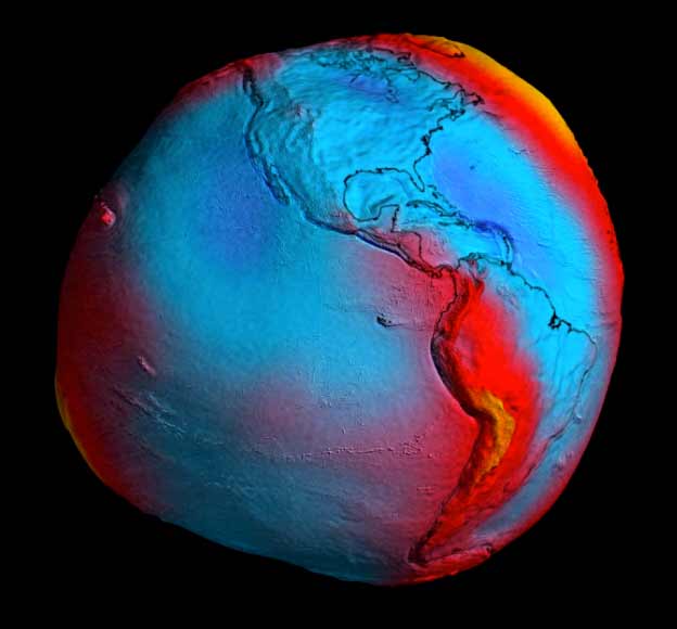 What these geoids show is the shape the oceans would adopt if there were no winds, no currents and no tides. Gravity is strongest in yellow areas; it is weakest in blue ones.