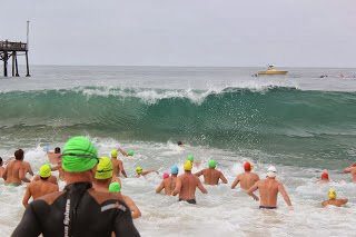 Photo shows the start of the Newport Pier-2-Pier swim in Newport Beach, California.