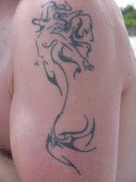 Mike Nie (left) from the island of Cayman Brac has a stingray with a barb fish. Shannon Cutting (right), a triathlete and an open water swimmer, wanted a unique tattoo and her friend created it for her in his apartment.