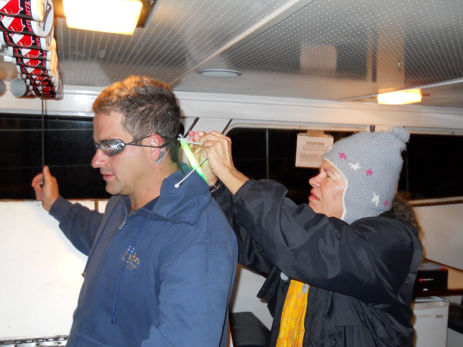 David touched Mike Vovk (shown getting his night glow sticks being attached to his goggles) who quickly swim off from Doctor’s Cove on Catalina Island on the second leg.