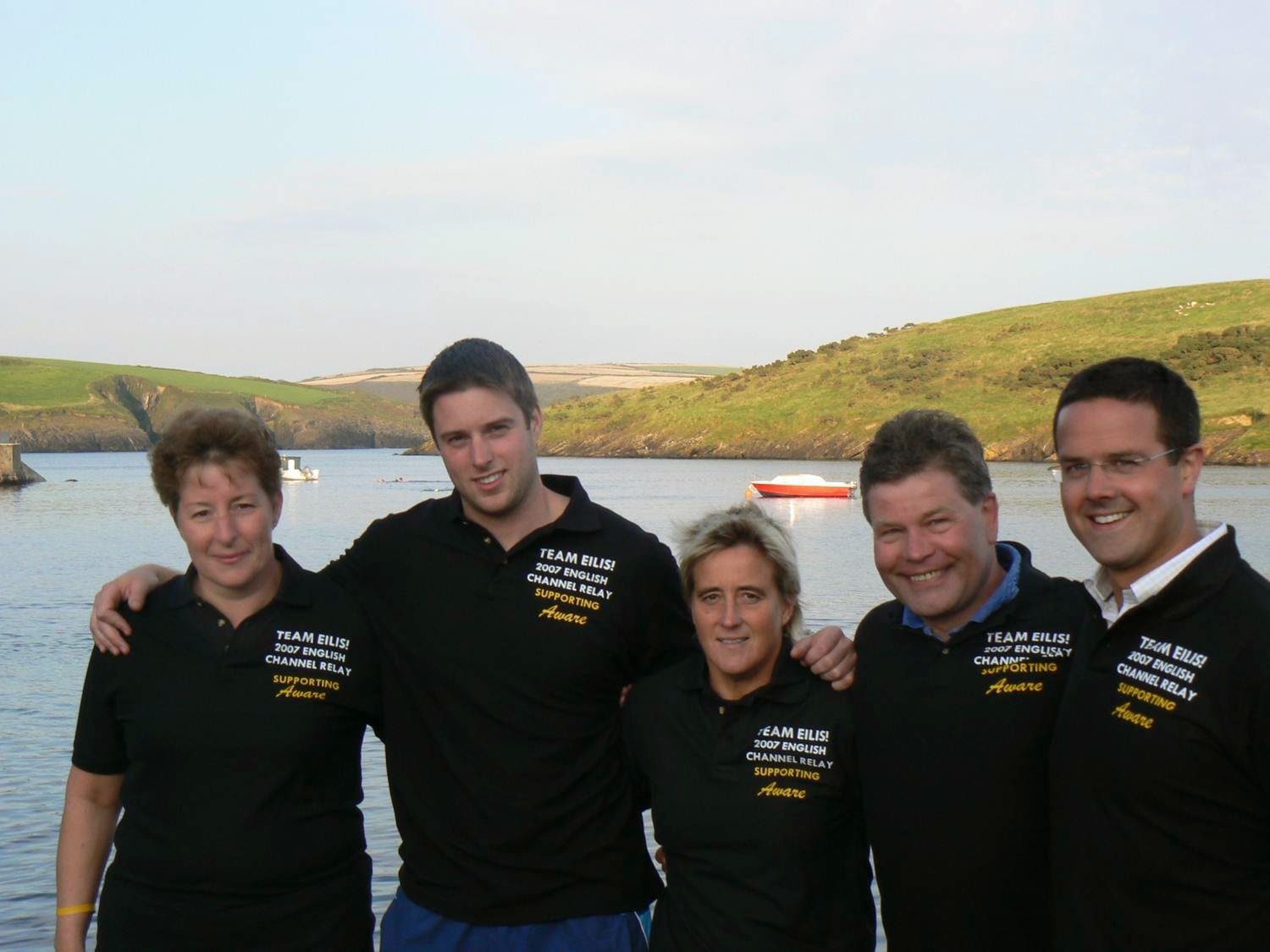 Photo above shows a successful 4-person English Channel relay with Imelda Lynch (far left), Patrick Sheehan (second from left), Coach Eilis Burns (middle), Oswald Schmidt (second from right), and Eddie Irwin (far right).