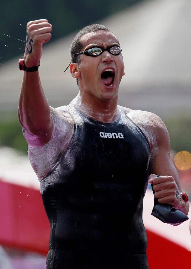 Mellouli kicked off the championships with his second straight gold medal victory in a major open water race after his dominant 10 km victory at the 2012 Olympics last summer (shown on left from London). “I didn’t expect to win the 5 km. I am really happy with the results. I did take six months off and got back into training not too long ago. To be on top of the world is quite exciting for me.”
