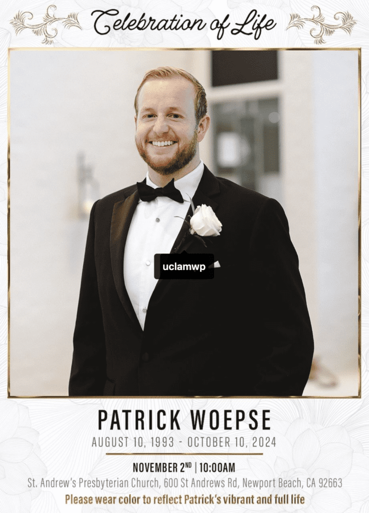 At Patrick Woepse‘s Celebration of Life yesterday at a jammed packed Newport Beach church, the young man’s legacy among his family, friends, teammates, and classmates was summed up by a quote of fellow UCLA alumnus Jackie Robinson, “A life is not important except in the impact it has on other lives.”