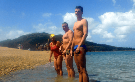 Penny Palfrey, Bernie Laverty and Michael Hanisch completed an unprecedented 11 km swim from Palm Bay on Long Island to South Molle Island and then to Daydream Island.