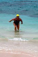 This morning, she swam 5 miles from Cayman Brac to Little Cayman Island as the first leg of her Bridging The Cayman Island. Swimming at a brisk 82 strokes per minutes, she was sandwiched between her kayakers, Jeff Kozlovich of Honolulu and Richard Clifford of New York, and 2 Department of Environment escort boats.