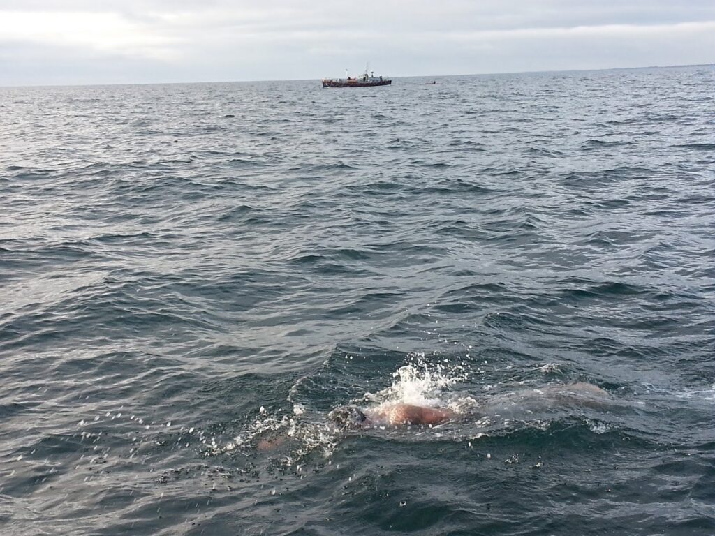 Photo below shows Darren Miller under the guidance of escort pilot Brian Maherg in Bangor Boats passing fellow American Pat Gallant-Charette in the distance with pilot Quinten Nelson. Maherg says of the crossing in the crossing, “The last time I think two swimmers were in North Channel together was late 1950’s. There has been nothing since then, so this is quite historic for the channel.”