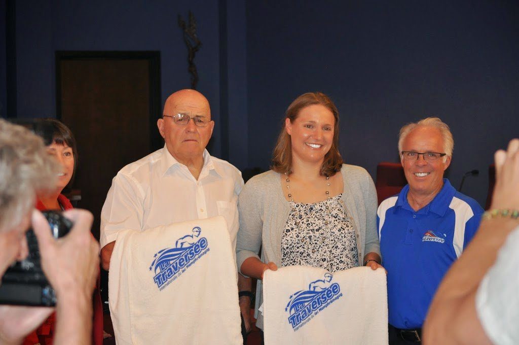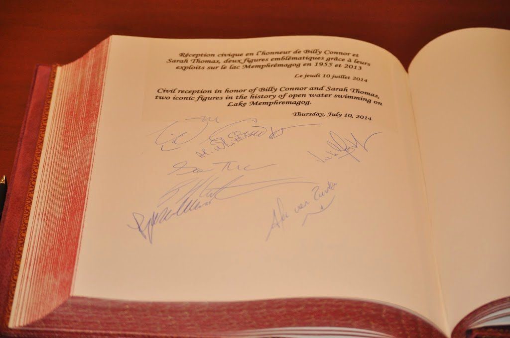Magog (Québec, Canada) Mayor Vicki May Hamm honored Billy Connor and Sarah Thomas at City Hall in Magog, Québec for their historic swims: Connor’s first traverse of Lake Memphremagog in 1955 when he swam through a thunderstorm and Thomas’ first double crossing in 2013 when she faced head winds in excess of 40 kph for the first eight hours of her swim.