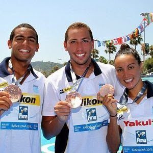 Photo shows Allan do Carmo, Poliana Okimoto, and Samuel Menegon De Bona after their bronze medal performance in the 5 km Team Pursuit at the 2013 FINA World Championships.