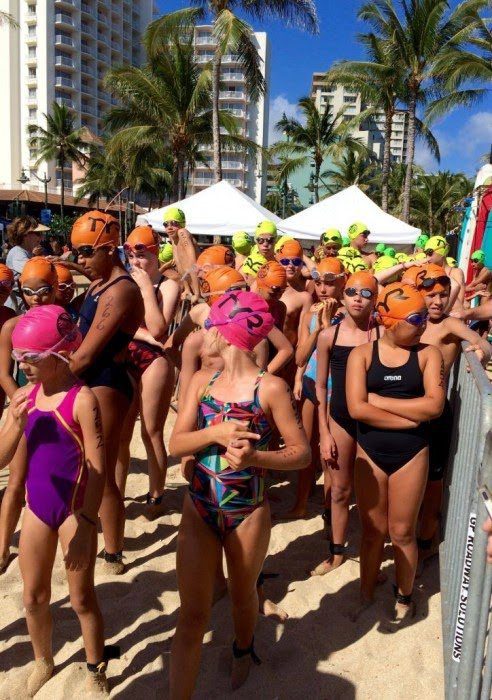 The Keiki (children) race was a half-mile swim for ages 14 and under and also included a 20-yard run on the beach between each loop. The format was the similar with the youngest swimmers starting first and the remaining age groups sent later from youngest to oldest. The first 10 swimmers who crossed the finish line received awards.