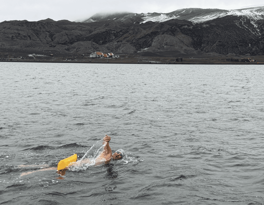 I first visited Deception Island in 2014 and again in 2018, both times slightly hungover after swimming. I’ve always wanted to swim there. It was a 12-year dream of mine. The first 200 meters is always very hard. Your body freezes until you feel nothing, breathing is very tight, and I know it will get better soon.