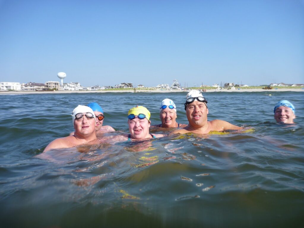 Bruckner Chase explains, “We added Special Olympics athletes to our ocean workouts here in South Jersey this morning. A total of 50 swimmers welcomed them as we taught basic skills for sighting and dealing with waves…these guys rock! These experiences can be so impactful experiences on whole communities.”