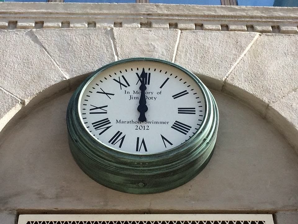 3. Two Jim Doty Memorial Clocks [see above] are posted at the clock tower at the L Street Bathhouse (Curley Community Center) in South Boston, Massachusetts. Named after International Marathon Swimming Hall of Fame Honour Swimmer James Doty the clocks aim to help swimmers training in the harbor know how long they have been swimming.
