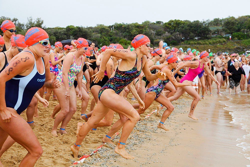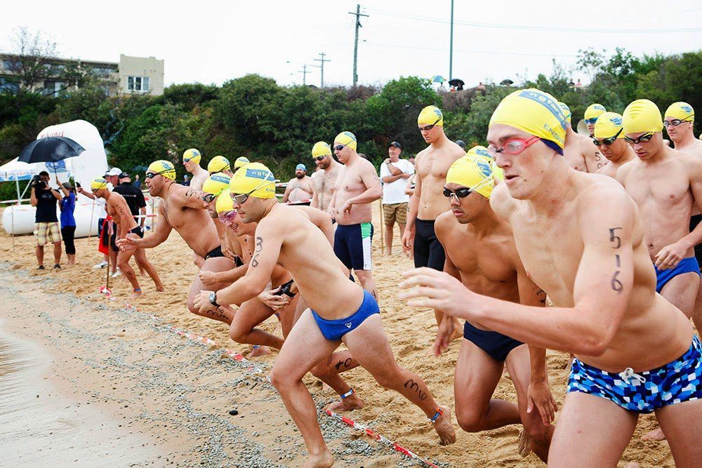 Swimmers are shown running in at the Murray Rose Malabar Magic Ocean Swim is touted as Sydney, Australia’s friendliest open water swim.