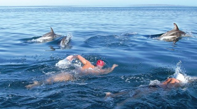 Ryan Stramrood swam with Theodore Yach and several dozens of marine friends between 3 Anchor Bay and Robben Island in Cape Town, South Africa yesterday.