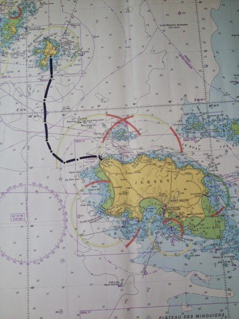Similar to the islands in Hawaii, the Santa Barbara Channel and between the California mainland and the Farallon Islands, there are possibilities of different routes between Sark and Jersey. Charlie Gravett spent many hours putting the navigation together on various charts. “Both British Admiralty and French charts as the tidal flows and currents are quite tricky.”