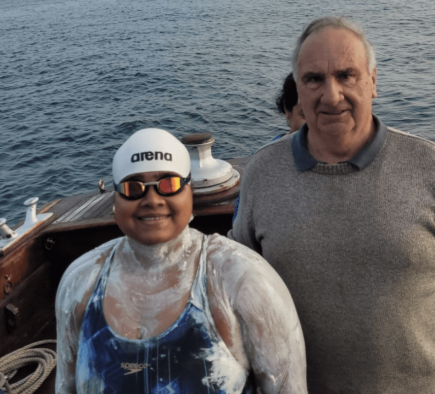She started her Oceans Seven journey in 2017 as a 19-year-old with a 14 hour 8 minute crossing of the English Channel. She followed up with the Catalina Channel in 12 hours 46 minutes in 2019, the Molokai Channel in 18 hours 50 minutes in 2022, the Cook Strait in 11 hours 47 minutes in 2024, and the North Channel in 13 hours 22 minutes in 2024 [shown below with escort pilot Quinton Nelson].