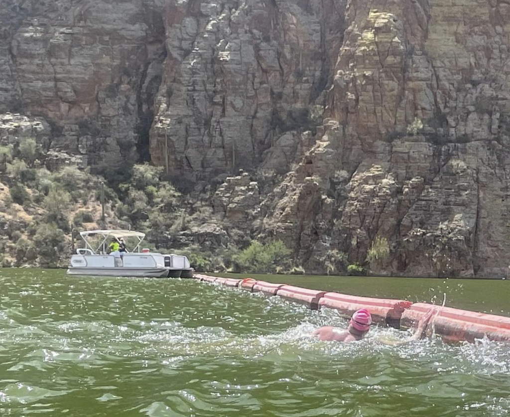 Race director Kent Nicholas (58, USA, MSF bio here) explained the conditions of the 15th edition of today’s Canyon Lake crossing, “If there was a day to swim Canyon, today was the day. There was a little push at the beginning which was a gift. A small release of water from Horse Mesa dam was basically an apology for the beat down we took at Saguaro yesterday. Wind was not an issue. Many smiles on the water.“