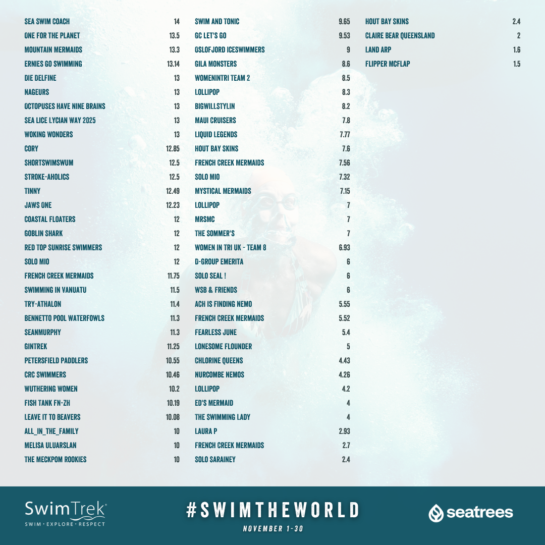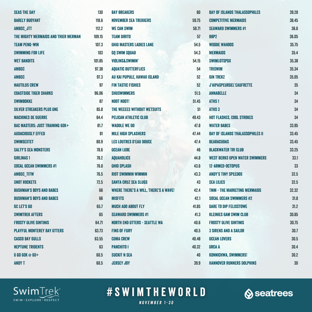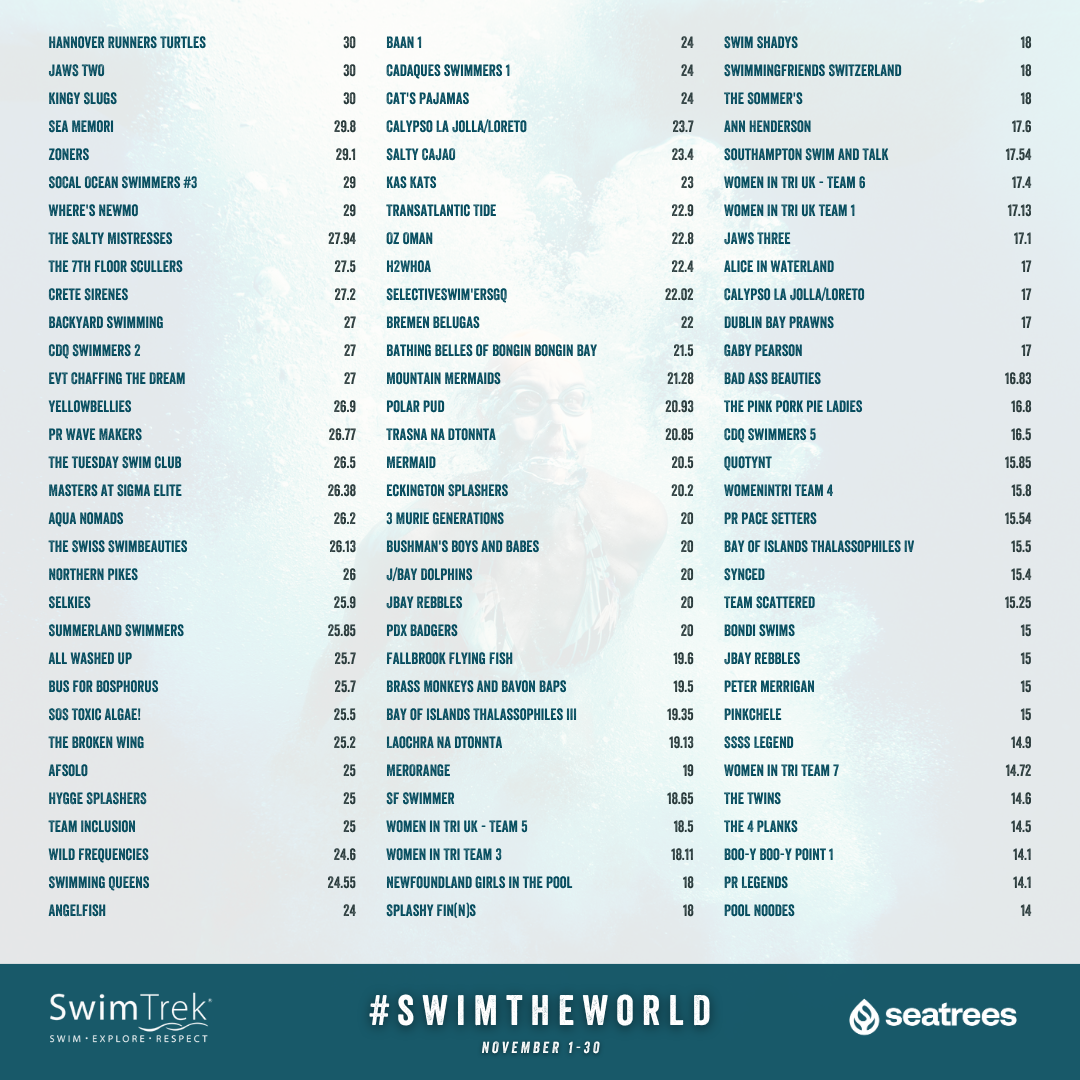 - How To Take Part: Swim solo or gather teams of up to 6 swimmers. If swimming as a team, elect a Captain to tally your swim distances and send the totals. Sign up on our easy to use online form. For every swimmer in your team, we will donate $5 to SeaTrees. You can also make individual donations to or fundraise for a charity of your choosing. There are prizes for the team or solo swimmer who travels the furthest before November 30th. Every Friday throughout November (1st-30th), you’ll send us your collective weekly distance (your captain will need to track and calculate this) for our Leaderboard.
