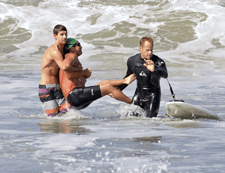 Steven Robles is shown above on the left after being rescued after a great white shark that bit him in Manhattan Beach (photo: Laura Joyce of Goofy Foot Photography).
