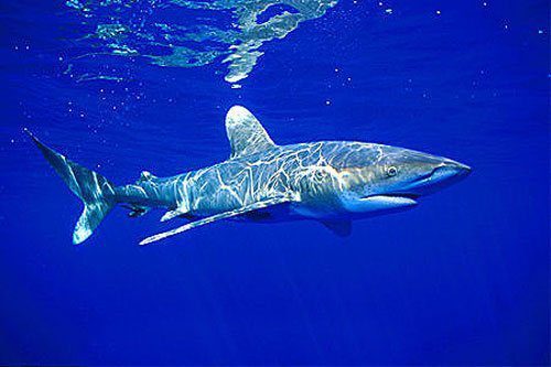 As Diana Nyad was nearing her 19th hour in the deep royal blue Caribbean Sea, a curious oceanic whitetip shark approached Nyad’s flotilla. Her support team on board her escort flotilla observed the whitetip swimming 2-3 meters under the surface a few hundred meters behind her and her mothership.