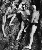 Barrie Devenport, shown on right resting on the cliff walls on Wellington Rock on South Island shortly after his historic finish in 1962, was the first man to cross the 26 km Cook Strait in 1962. He start at Cape Terawhiti on North Island and finished 11 hours 20 minutes later on South Island on his second attempt.