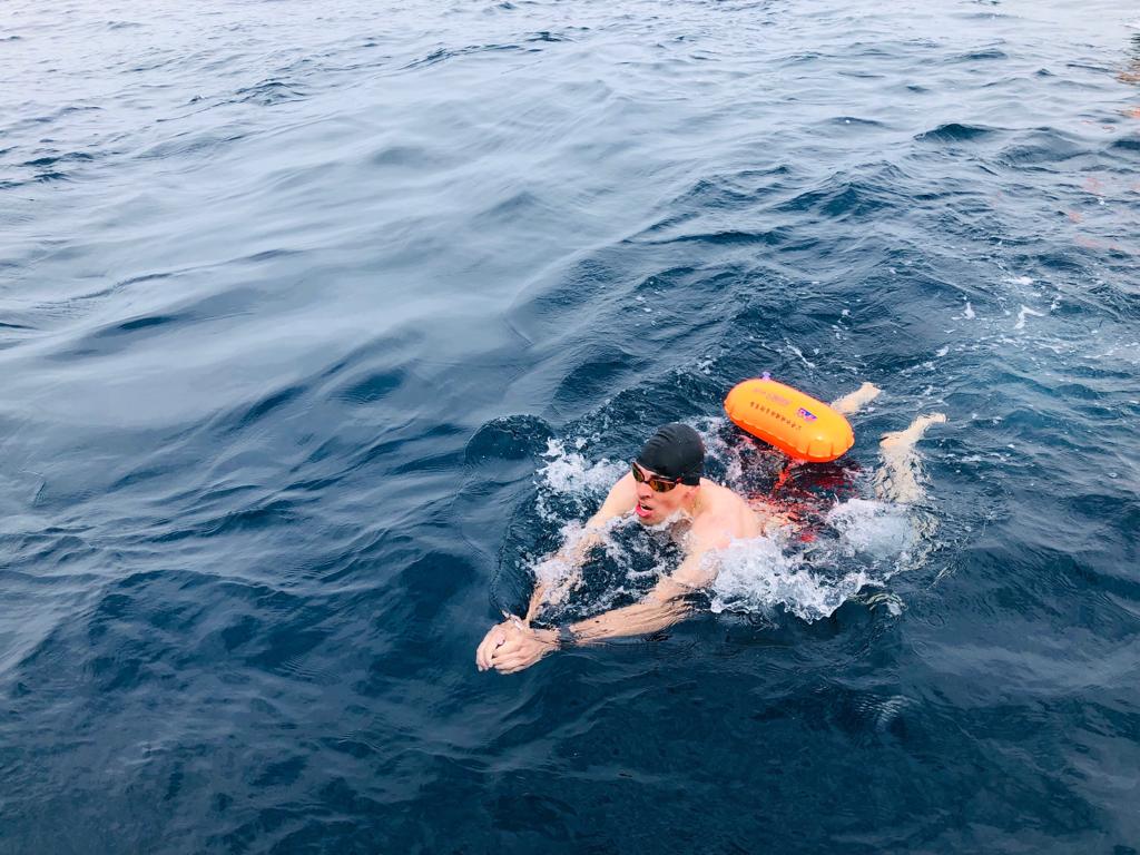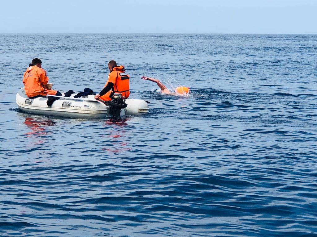 Brylin explained, “The first stage was 22.2 km in July from Cape Crillion in Russia to a point along the 12-mile international zone towards Cape Soi in Japan, deep into the La Pérouse Strait. The second stage was another 22.2 km relay from a point along the 12-mile international zone within the La Pérouse Strait to Cape Soi in Japan.”