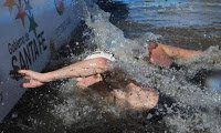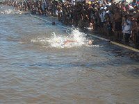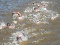 Simon finished just ahead in 1:55:04.3 over Alexander Studzinski of Germany in in 1:55:04.6 in the 15K race in 24°C river water (see below). Frenchman Bertrand Venturi was third in 1:55:34.