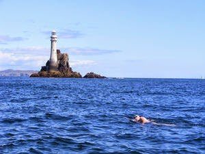 Photo shows Stephen Redmond swimming towards Fastnet Rock.