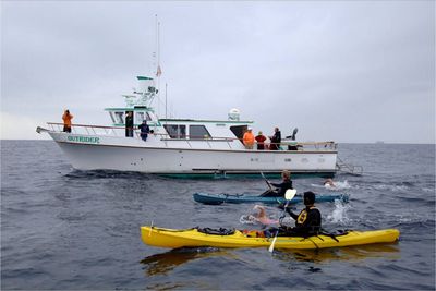 All in the comfort of the Team FTD escort boat, the Outrider captained by John Pittman. “The team started at Cabrillo Beach on the California mainland, traversed the Catalina Channel to Moonstone Beach on Catalina Island, then to Royal Palms on the mainland, back to Empire Landing on Catalina, then to Portuguese Bend on the mainland and to Doctor’s Cove on Catalina and finally to Terranea Cove on the mainland,” reported Nelson.