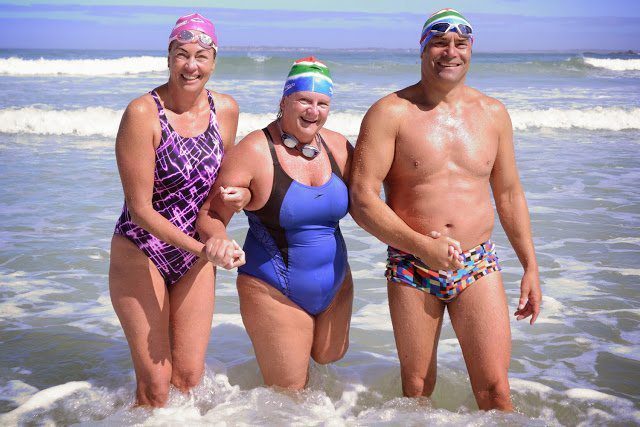 Before he passed away, Theodore Yach of South Africa [shown above on right with Delle Henry on left and Maura Sanderoff in middle] explained the real-life situation that he was once in. “Two years ago, I was involved in a real-life similar scenario: The plan was to launch a duck at Blouberg, boat to Robben Island and swim back. It was the swim to raise money for Maura Sanderoff’s new prosthetic leg.
