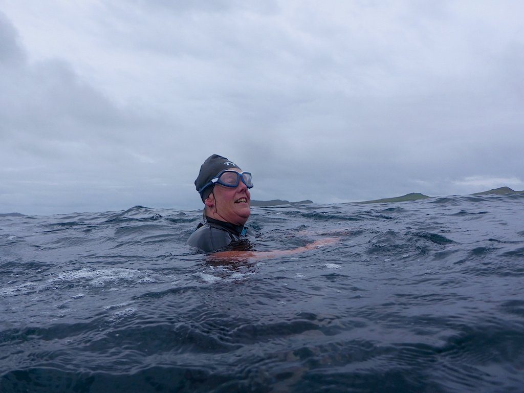 Moore describes, “Sioban has limited movement of legs and other challenges, but she was a pool swimmer. She contacted me in March to help her with the sea as her hotel pool closed. Her choices were zero activity or using the freezing waters off our home beaches in March. Water temps were 10°C.