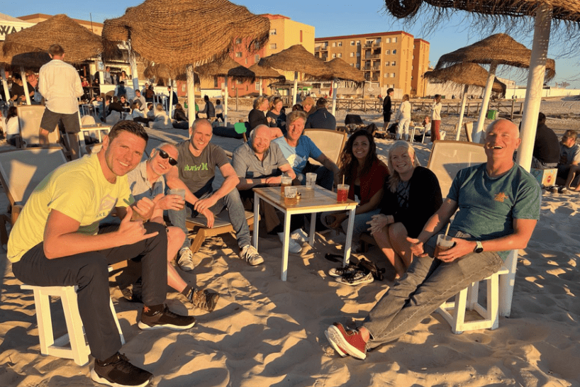 Woodhouse with his fellow Red Top Swimming Club members with Coach Matt Duggan. From left to right: Jamie Mackay, Paul Leonard, Coach Tim Denyer, Coach Matt Duggan, Rob Woodhouse, Zeina Alsharkas, Jo Norman, and Miles Worling.