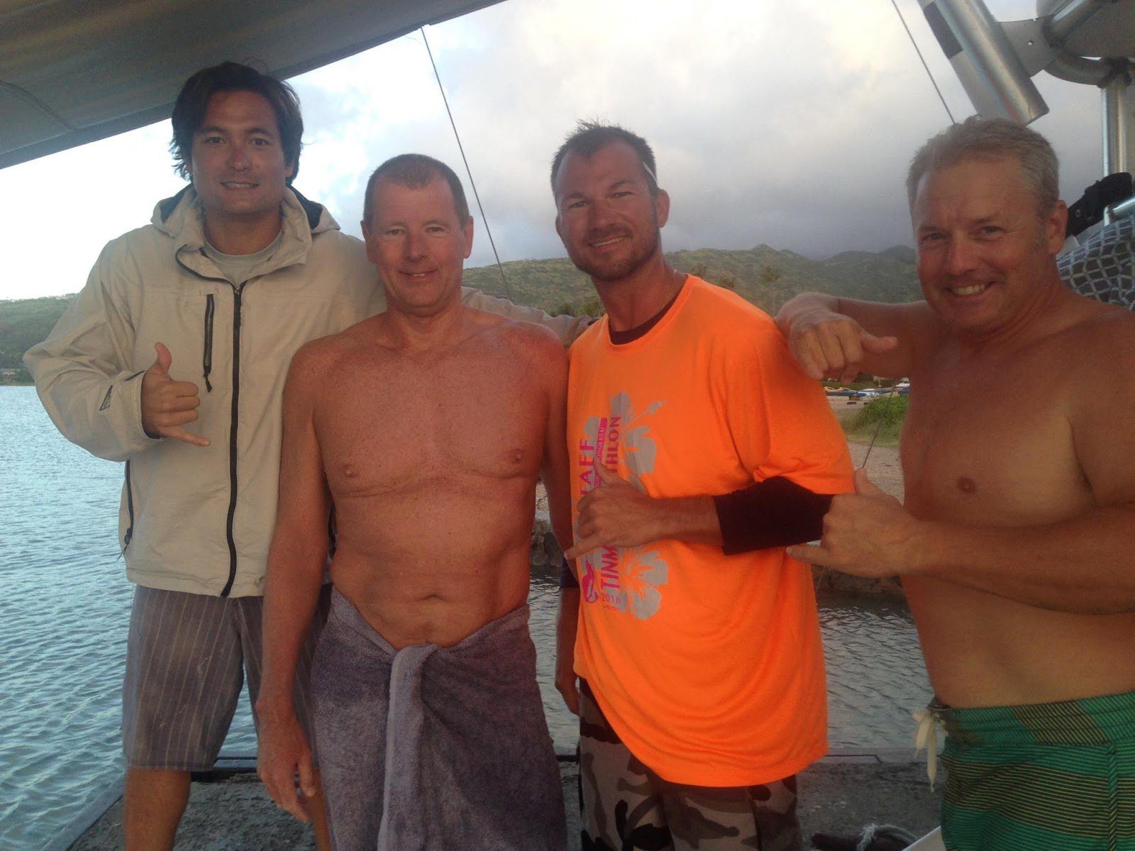 Junk is shown with his escort team and pilot Mike Twigg-Smith after his Molokai Channel crossing.