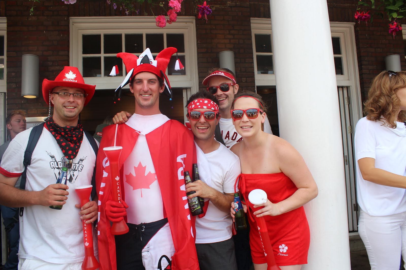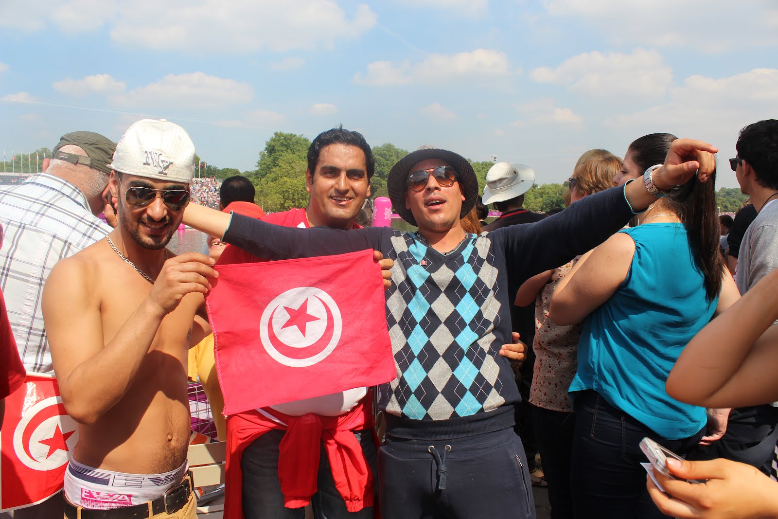 Many groups were colorfully outfitted in specially designed shirts or hats, and many wove their country flags in support of their favorite athletes.