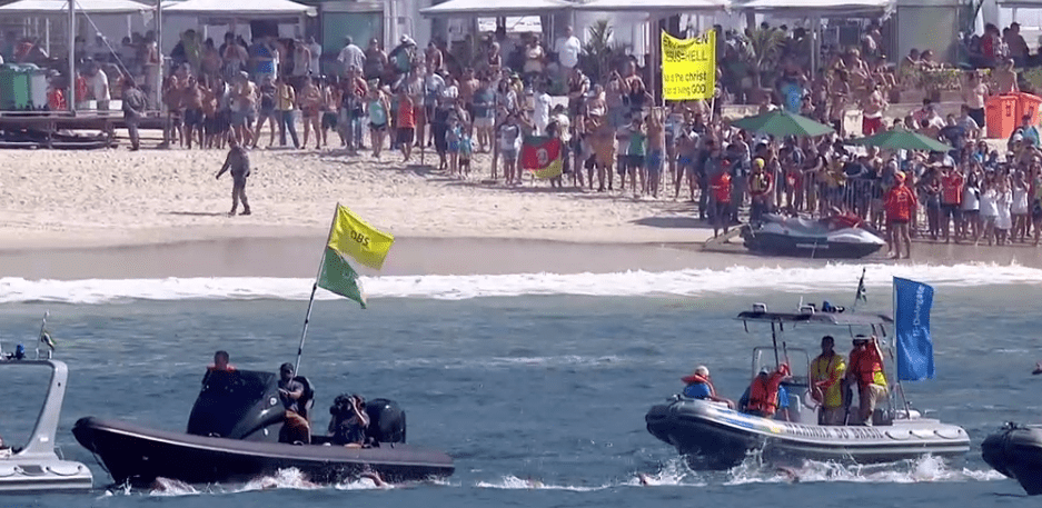 There are plenty of support and safety personnel on the women’s Olympic 10K Marathon Swim on Copacabana Beach in Rio de Janeiro.