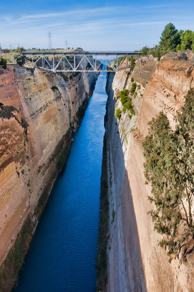 The Corinthian Isthmus is a narrow strip of land that connects mainland Greece with the Peloponnese while the canal that has been opened joins the Saronic Gulf with the Corinthian Bay. The canal crosses a straight line the Corinthian Isthmus in length 6,346 meters. The width is between 21.3 and 24.6 meters while the depth varies between 7.50 – 8 meters.