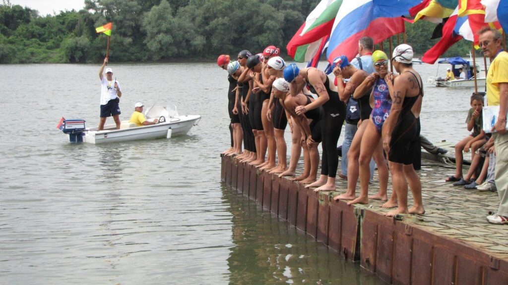 Photo of the start of the Plivački maraton Jarak-Šabac (Jarak-Šabac Marathon Swim) in Serbia by Vojislav Mijić shows this contrast in the women’s elite heat.