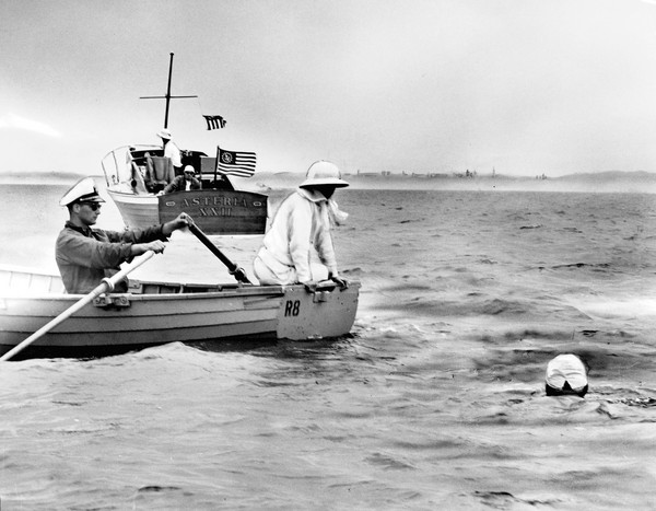 16 swimmers from 6 countries stepped it up in 1963 when Moran increased the distance to a seemingly impossible 60 miles. One year to the hour since the 1962 race, the field started at Burnham Harbor. Erikson remembers as if it were yesterday. “Abou-Heif, Greta, and an Argentine swimmer set a fast early space followed by myself and others. Throughout the afternoon swimmers dropped out leaving only Abou-Heif ahead of me by about a mile by evening. In the darkness, my handlers cut all lights on the boat. We crept to within a quarter mile of About before our tactic was recognized. He burst away to win as I kept on swimming to finish in 37 hours 42 minutes, gaining a disturbing title of the best second place finisher in these races. Piqued, those swims prompted a solo 1965 double English Channel crossing in 30 hours 3 minutes, lowering the [then-existing] record by 13 hours.”