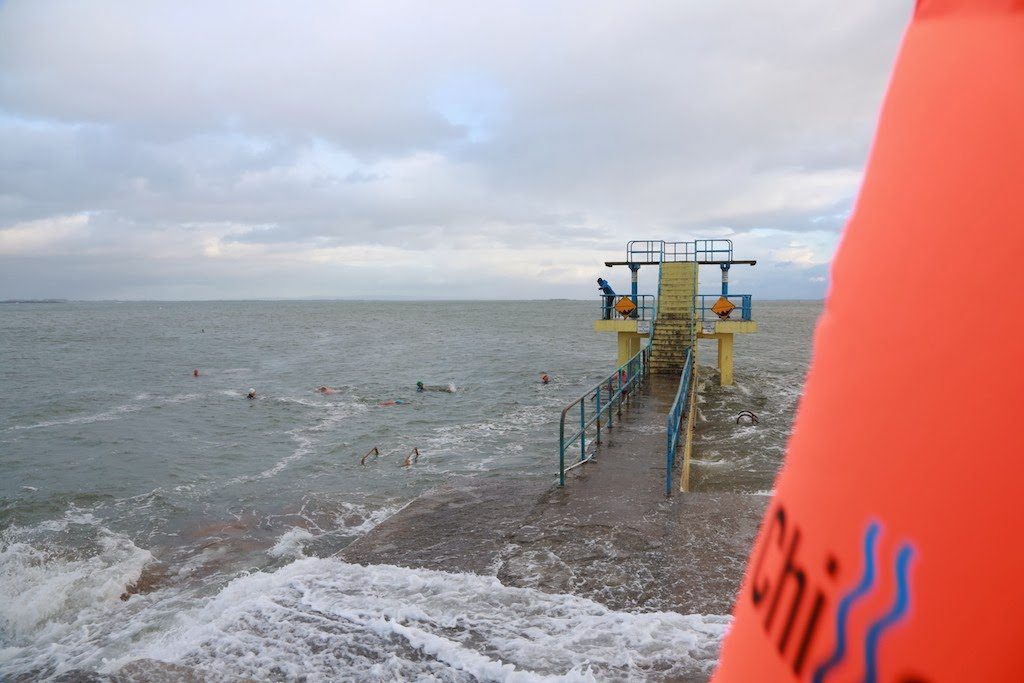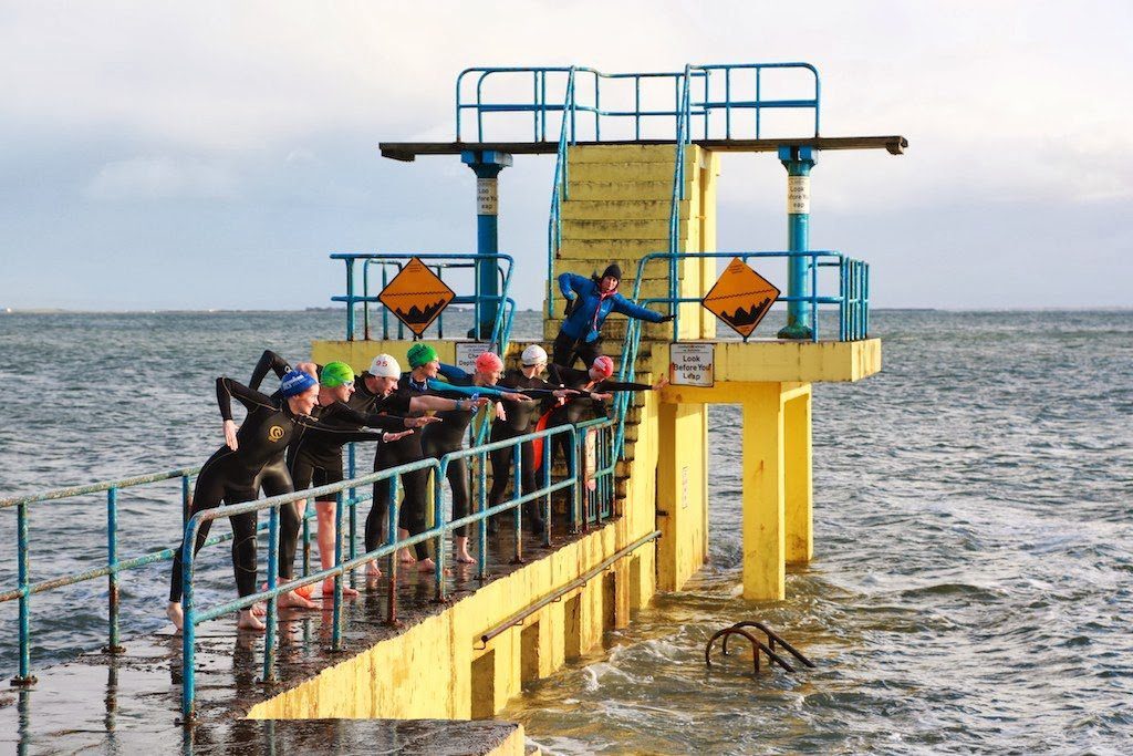 These swimmers range greatly in both swim ability and experience, in pool and open water. The groups meet at the diving boards in Blackrock, Salthill, Galway, from March-April to October-November, and usually swim parallel to shore or triangular circuits. Despite rain and wind, with sea temps in November of 10-14ºC, it is a perfectly safe swim swim venue with no dangerous rips, currents or sharks. The local triathlon and men’s water polo clubs also sea swims. Several open water swim events start and finish here.”