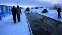 The event took place a frozen lake just outside of Tyumen Tyumen. Surrounded by trees caked in a snowy winter ice, the organizers cut two 25m pools in the ice with two lanes each. Wooden decks served as a start platform while the walls of the extreme pool were 1m wooden planks at the edges.