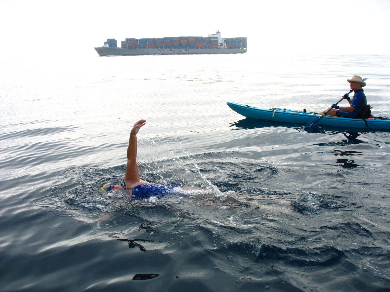 Combat side stroke by Kelly Gneiting across the Anacapa Channel in 2014. For his later unprecedented crossing of Navajo Lake, Gneiting was nominated for the 2015 World Open Water Swimming Performance of the Year.