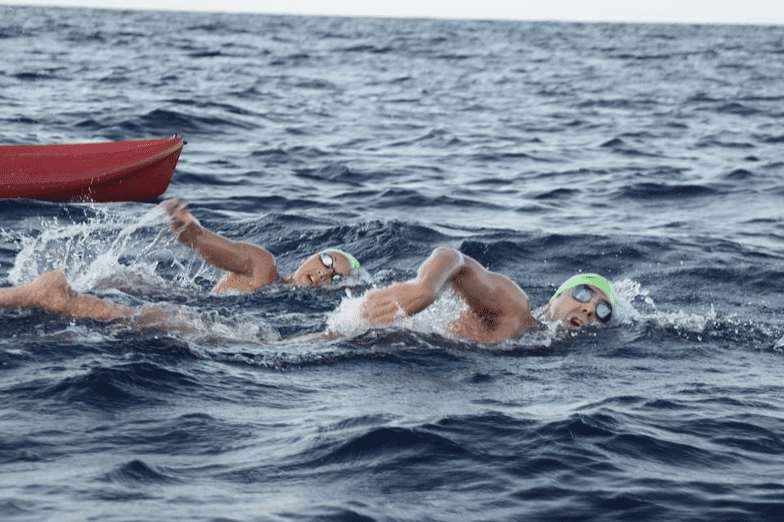 Lexie Kelly and Steven Munatones swimming across the Cayman Brac Channel