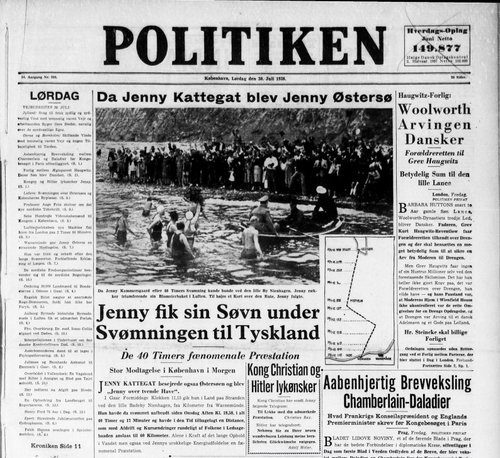 In July 1937, 19-year-old Jenny Kammersgaard attempted to swim across the Kattegat from Gniben to Grenaa in the Danish part of the Baltic Sea, the longest any woman had swum at the time (Kattegat Svømning). She was forced to quit on the advice of her doctor -as she was protesting to allow her to continue – after swimming 20 hours on this attempt.