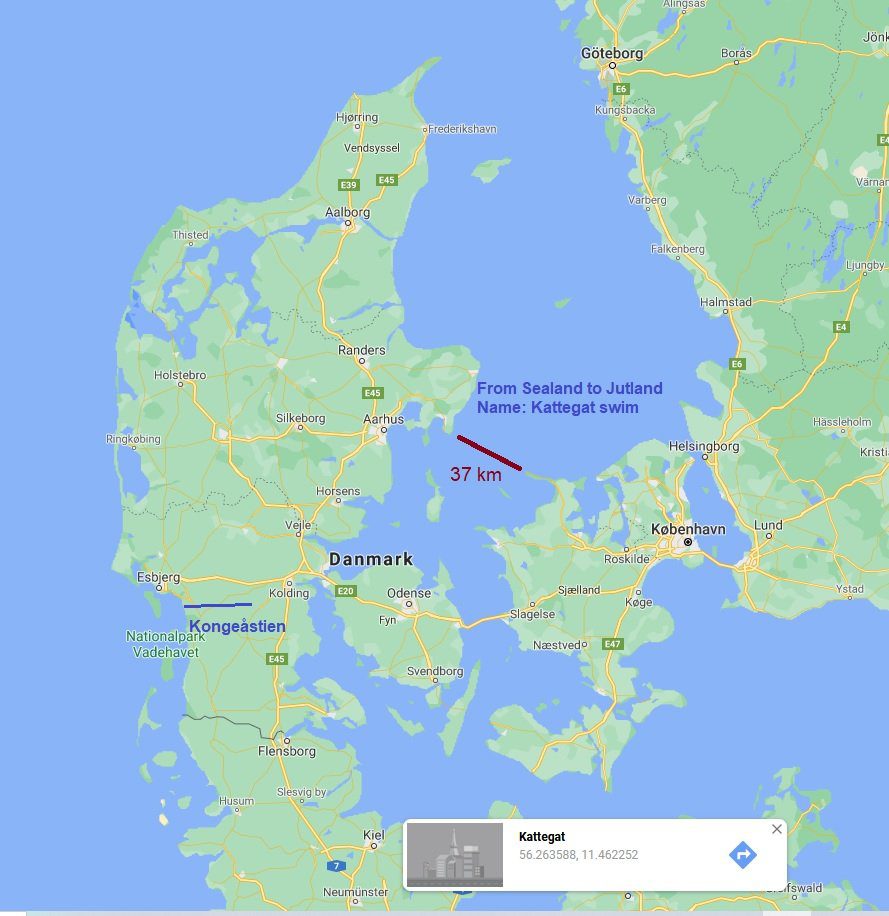 Between 1930 and 1940, there were some excellent marathon swimmers in Denmark, but there is a gap from then and to date. In Denmark, there is a 37 km swim called ‘The King Distance’ or ‘King of the Sea‘ that was first swum in 1938. The start of the swim is Gniben on Sealand and the finish is in Jutland.