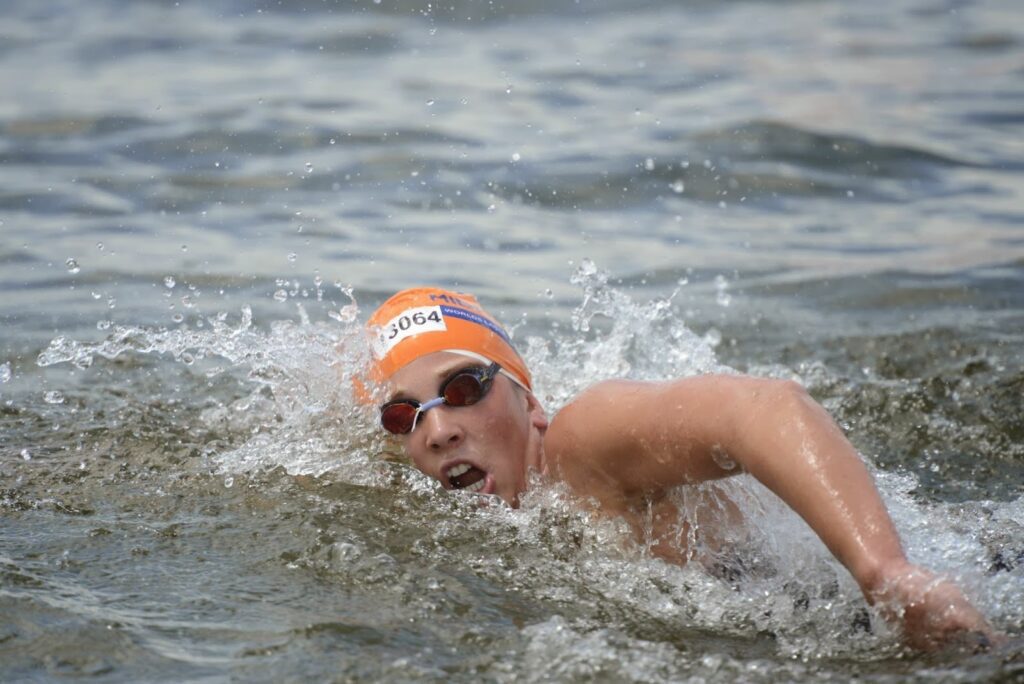 Photo of Ashley Twichell courtesy of Anthony Grote/Gameplan Media. Notice Twichell’s five-digit race number on her swim cap.